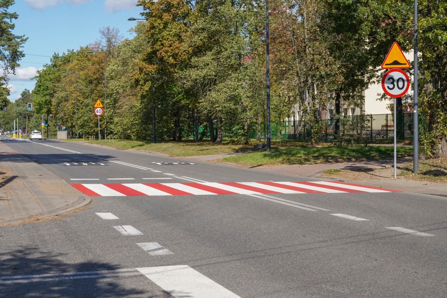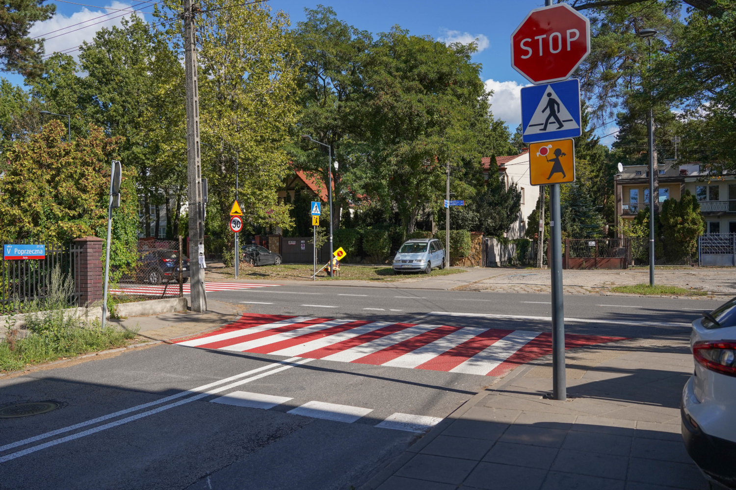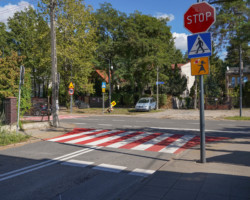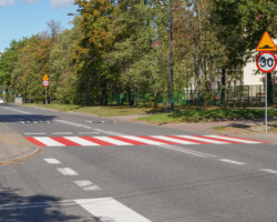 Wspomniana szkoła znajduje się przy ul. Kajki. To właśnie w jej ciągu na pobliskim skrzyżowaniu z ul. V Poprzeczną zamontowaliśmy progi zwalniające. Ponadto jadący tą drugą ulicą mają teraz obowiązek zatrzymać się przed skrzyżowaniem – stanął tam znak „stop”. Znajdujące się tam dwa przejścia dla pieszych zostały dodatkowo oznaczone czerwoną farbą.