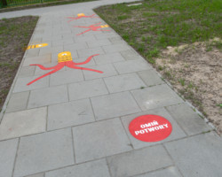 Poza poprawą bezpieczeństwa CoMobility podjęło się również zadania uatrakcyjnienia uczniom SP 218 drogi do szkoły. W taki oto sposób na chodniku wzdłuż ul. Kajki kilka lat temu powstały malunki „Po Drodze”.