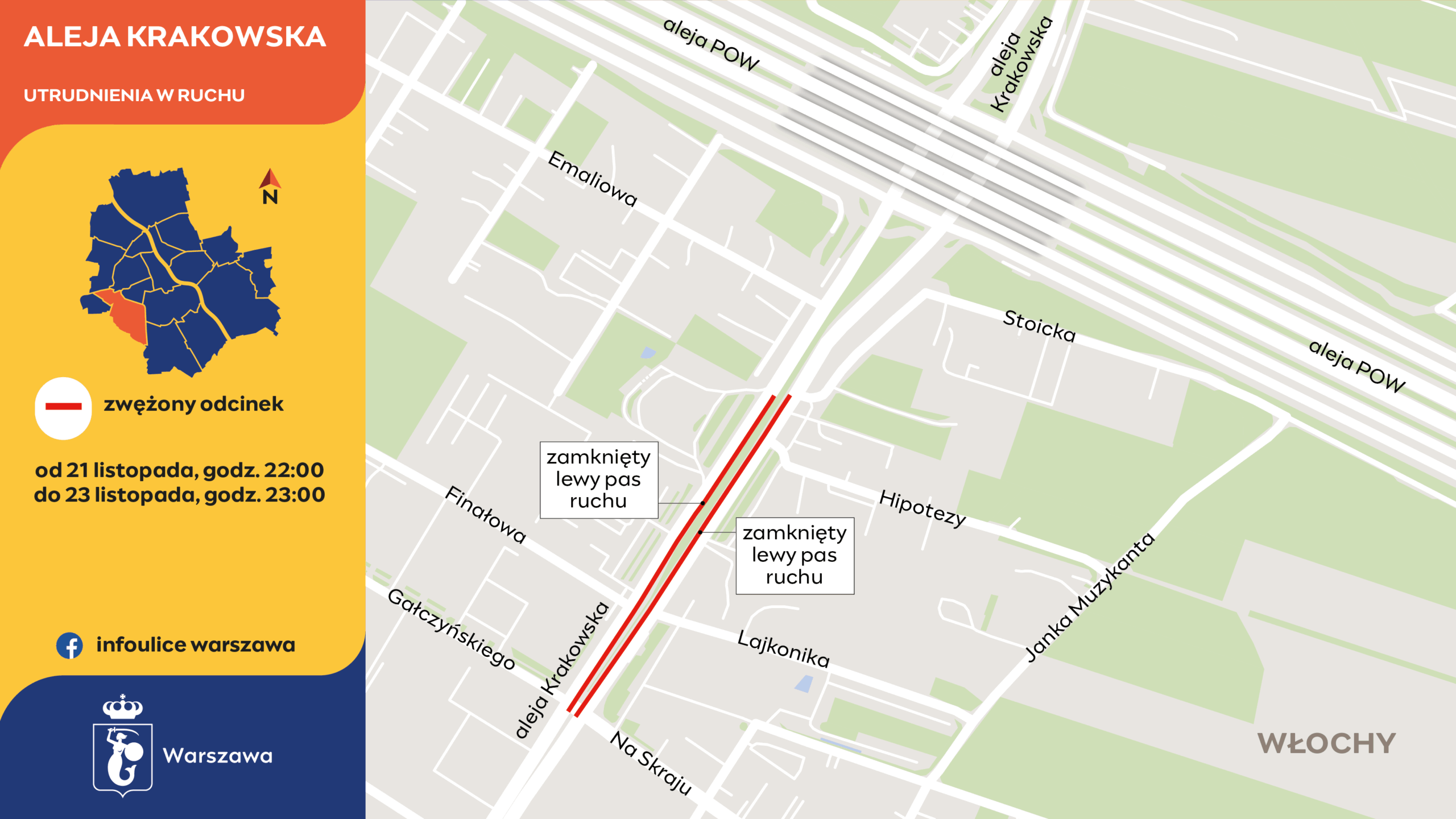 W stronę wyjazdu z Warszawy wygrodzenia zostaną ustawione za wjazdem na stację benzynową. Trzy pasy wrócą za skrzyżowaniem z ul. Gałczyńskiego w Raszynie. W kierunku Południowej Obwodnicy Warszawy prace będą od skrzyżowania z ul. Na Skraju do dojazdu do ul. Stoickiej. Kierowcy nie skręcą w ul. Na Skraju w lewo. Nie będzie także przejazdu na wprost między ulicami Gałczyńskiego a Na Skraju. Z obu tych ulic w al. Krakowską kierowcy wyjadą tylko w prawo.