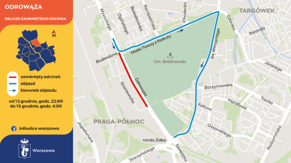 Ulica Pożarowa straci połącznie z ul. św. J. Odrowąża. Skrzyżowanie z ul. Staniewicką pozostanie otwarte. Objazd do ronda Żaba został wyznaczony ulicami Matki Teresy z Kalkuty i św. Wincentego. Do ulicy Pożarowej dojazd będzie ul. Staniewicką.