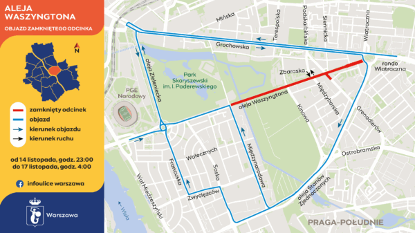 Remont rozpocznie się w piątek, 14 listopada o godz. 23 i potrwa do poniedziałku, 17 listopada do godz. 4. W tym czasie al. Waszyngtona będzie zamknięta w obu kierunkach pomiędzy ul. Międzynarodową a rondem Wiatraczna. Pracować będziemy jednak na nieco krótszym odcinku – od skrzyżowania z ul. Kinową do ronda.