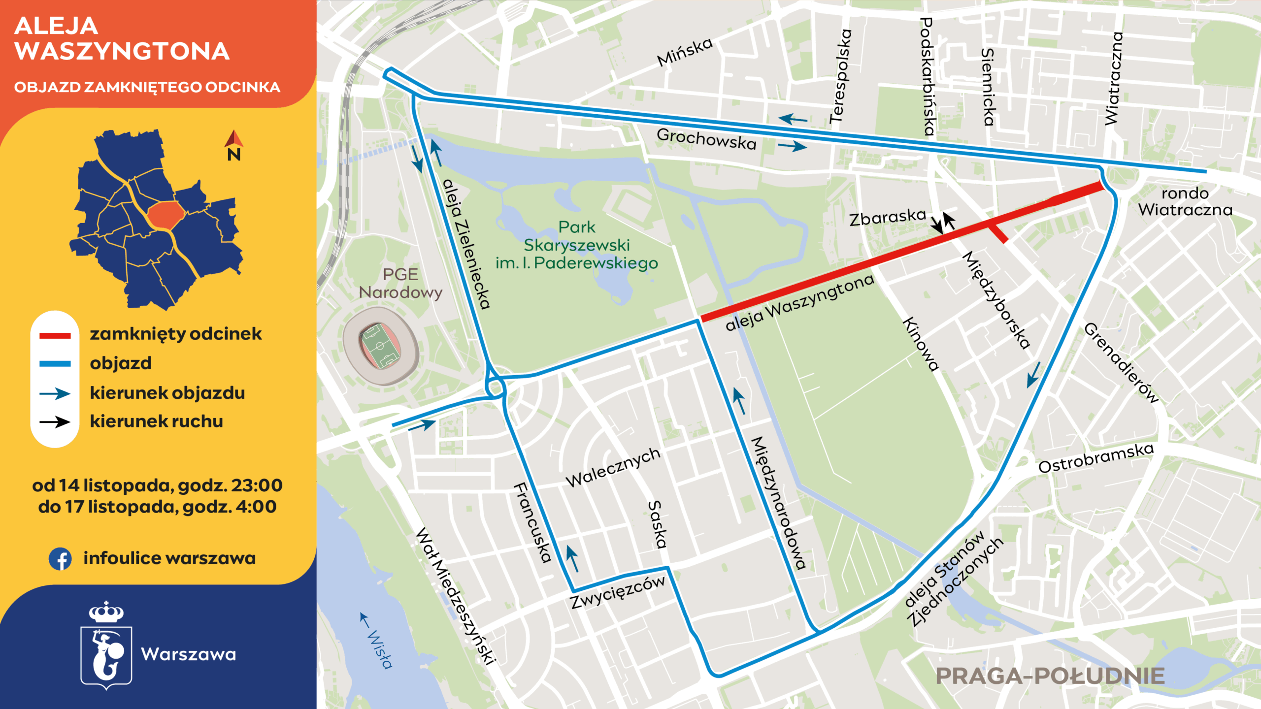 Z ronda Waszyngtona w kierunku ronda Wiatraczna kierowcy zjadą dwoma pasami. Znaki zakazu ruchu staną za skrzyżowaniem z ul. Międzynarodową. Wyjazd z ul. Międzynarodowej od strony ul. Zwycięzców będzie jednym pasem – prosto lub w lewo. Zamknięte zostaną skrzyżowania al. Waszyngtona z ulicami Kinową, Międzyborską, Grenadierów, Garibaldiego i Modrzewiową. Przejazd boczną jezdnią wzdłuż bloków pomiędzy ulicami Kinową a Międzyborską pozostanie otwarty.