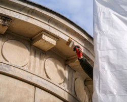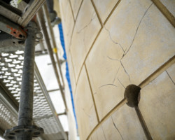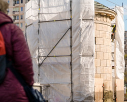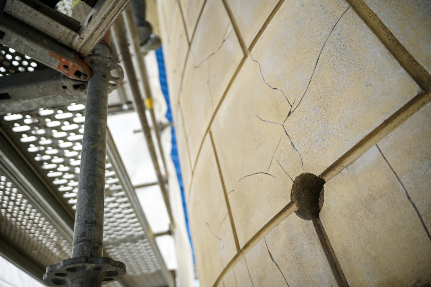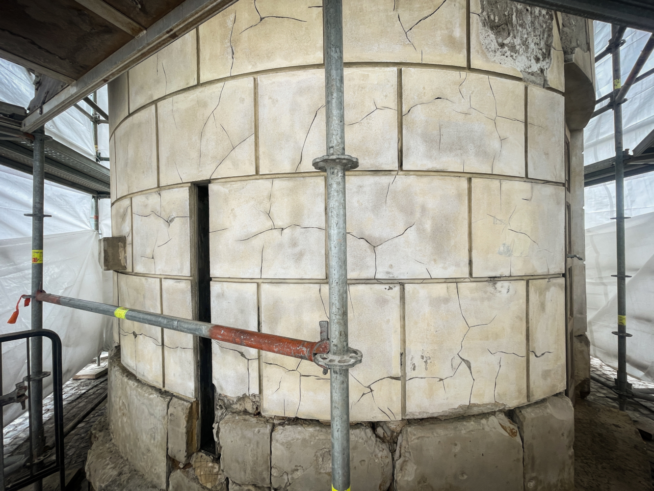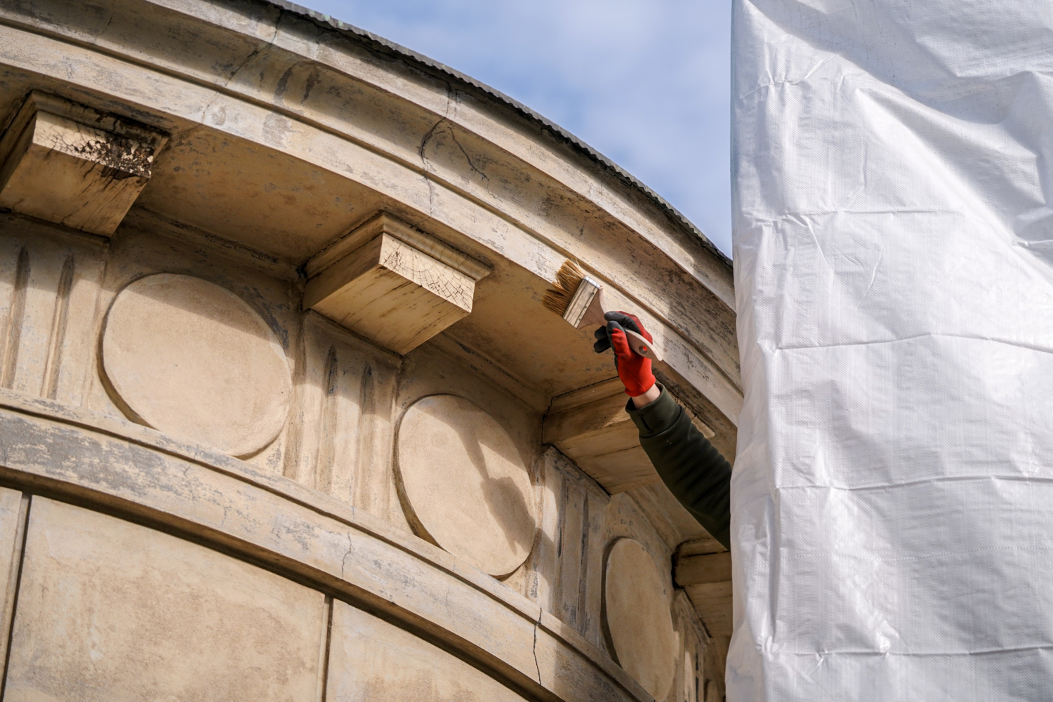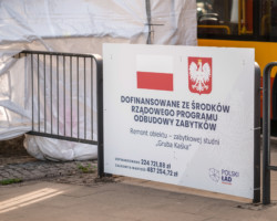 Zaawansowane są również roboty przy elewacji i cokole obiektu. Obejmują one: czyszczenie powierzchni, dezynfekcję, usuwanie nawarstwień biologicznych, wzmocnienie podłoża, naprawę rys i uzupełnienie ubytków tynków. Prowadzone są także prace przy elementach drewnianych i metalowych na zewnątrz, w tym ich oczyszczanie, zabezpieczenie i przygotowanie do dalszych etapów wykończeniowych.