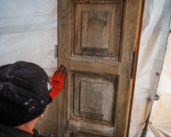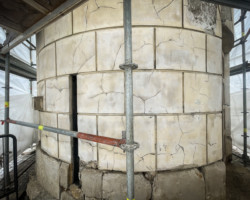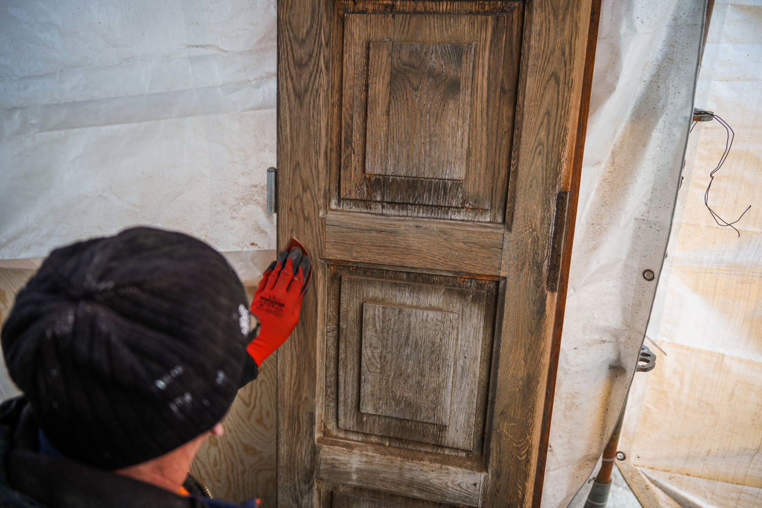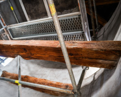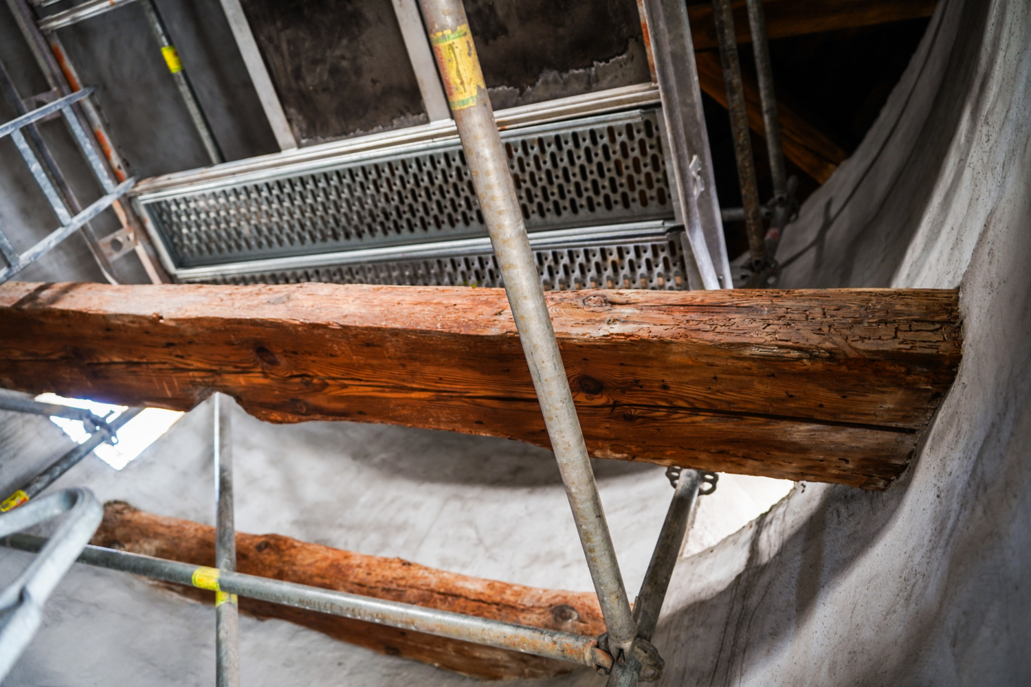 Wewnątrz obiektu realizowane są roboty renowacyjne obejmujące ściany, podłogę, belki drewniane oraz historyczny kołowrót. Zakres tych prac obejmuje m.in. oczyszczanie i dezynfekcję powierzchni, naprawę uszkodzeń, uzupełnianie ubytków, przygotowanie elementów drewnianych oraz ich zabezpieczenie konserwatorskie. W pierwszym etapie ujęto także ponowny montaż kołowrotu wraz z jego renowacją.