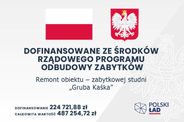 W ubiegłym roku ogłosiliśmy przetarg, w wyniku którego wyłoniliśmy wykonawcę remontu zabytkowej studni. „Gruba Kaśka” jest obecnie osłonięta, prowadzone są działania, które pomogą jej odzyskać dawny blask.