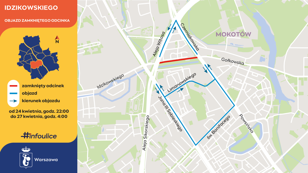 - Zamknięta będzie ulica Idzikowskiego od Alei Witosa do Powsińskiej;