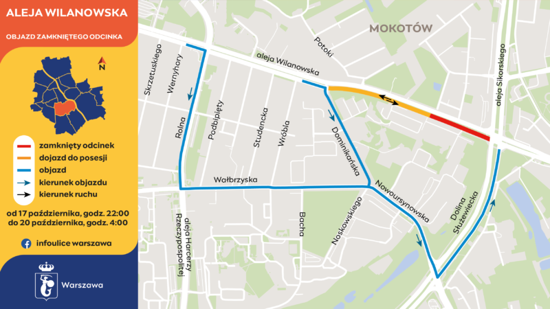 Wymienimy nawierzchnię także w alei Wilanowskiej. Od piątku, od godziny 22:00 do poniedziałku, do godziny 4:00 kierowcy nie przejadą w kierunku Wilanowa, od ulicy Dominikańskiej do skrzyżowania z ulicą Dolina Służewiecka i aleją Sikorskiego. Objazd został wyznaczony ulicami Dominikańską lub Rolną do Wałbrzyskiej, Nowoursynowskiej i Doliny Służewieckiej. Utrudnienia można także ominąć Bukowińską i Idzikowskego lub dojeżdżając ulicą Puławską do Wałbrzyskiej. Mieszkańcy osiedla przy alei Wilanowskiej 259/287 będą mogli przejechać zamkniętym odcinkiem alei Wilanowskiej – od Dominikańskiej do posesji pod numerem 263 będą dwa kierunki ruchu. Autobusy linii: 107, 163, 164, 217, 251 i 519 ominą remontowany odcinek jadąc ulicami: Dominikańską, Nowoursynowską i Doliną Służewiecką. Szczegółowe informacje w serwisie Infoulice Warszawa.
