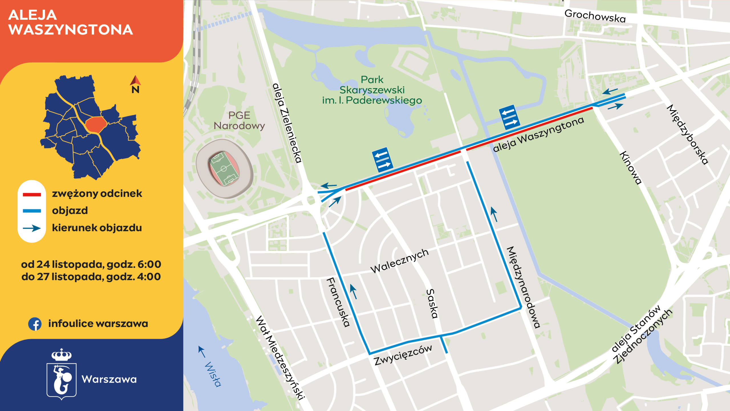 Ulica Saska straci połączenie z główną jezdnią al. Waszyngtona. Będzie można tylko skręcić na jezdnię lokalną do ul. Międzynarodowej. Skrzyżowania z ulicami Międzynarodową i Kinową pozostaną otwarte. Na skrzyżowaniu z ul. Kinową kierowcy wrócą na swoją stronę jezdni. Zebry przy ulicach Saskiej, Niekłańskiej i Międzynarodowej będą otwarte podczas przerw w pracach.
