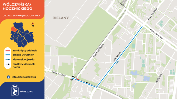 W tym czasie przejazd ul. Wólczyńską będzie możliwy wyłącznie na wprost. Kierowcy nie skręcą w ul. Nocznickiego. Z kolei jadący ul. Nocznickiego od strony Młocin będą miesili skręcić w prawo, w kierunku ul. Arkuszowej.
