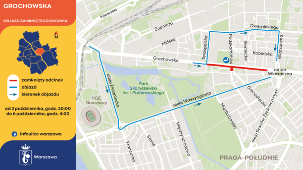 Zamknięta zostanie jezdnia ul. Grochowskiej w stronę ronda Wiatraczna za skrzyżowaniem z ul. Terespolską do skrzyżowania z ul. Modrzewiową wraz z samym skrzyżowaniem. Zamknięte będą też skrzyżowania remontowanej nitki ul. Grochowskiej z ulicami Międzyborską i Siennicką.