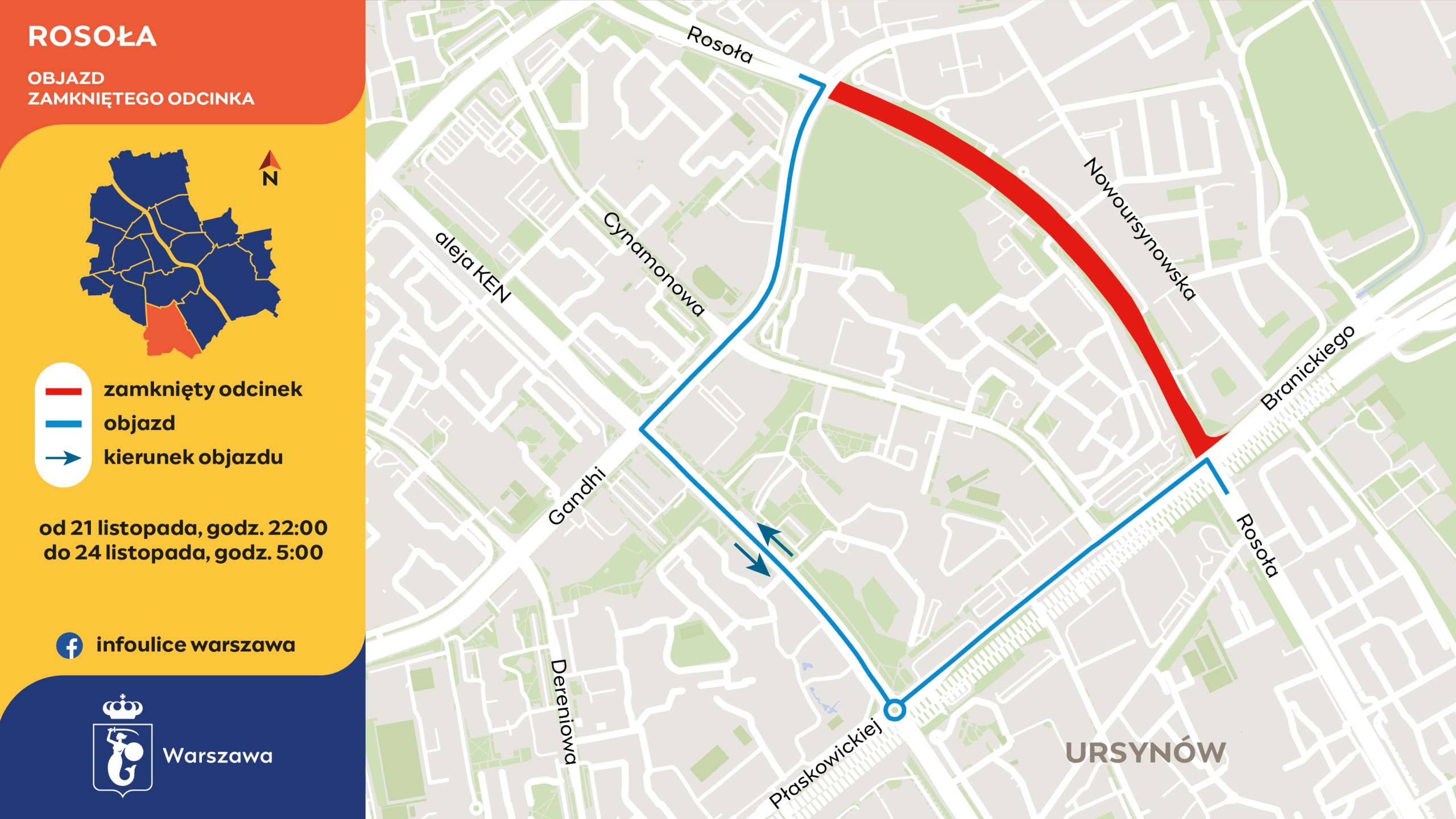 Ulica Rosoła zostanie zamknięta w obu kierunkach pomiędzy skrzyżowaniem z ulicami Płaskowickiej i Branickiego a skrzyżowaniem z ulicami Gandhi i Nugat. Ulice dochodzące do remontowanego odcinka stracą połączenie z ul. Rosoła. Z budynku przy ul. Rosoła 58 wyjazd będzie tylko w stronę ul. Nugat. Objazd poprowadzi ul. Płaskowickiej, al. Komisji Edukacji Narodowej i ul. Gandhi.