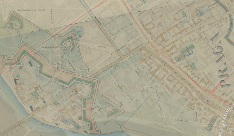 Plan stołecznych fortyfikacji z 1831 roku, nałożony na współczesną siatkę ulic. Na mapie widoczny jest przebieg umocnień – okolice skrzyżowania Okrzei z Sierakowskiego. Obraz z serwisu mapowego m.st. Warszawy.