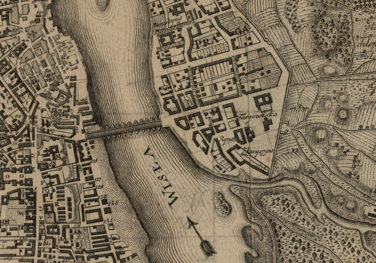 Dziś ulica Okrzei prowadzi do mostu pieszo-rowerowego. Po przebudowie ma stać się jego naturalnym przedłużeniem, wygodnym pieszym traktem prowadzącym z Bulwarów Wiślanych na Starą Pragę. Ale to nie pierwszy most w tym miejscu. Podobnie jak dziś, dawniej ulica Okrzei (wówczas Brukowana) prowadziła do mostu łyżwowego – tzw. mostu Ponińskiego, zbudowanego w 1775 roku. Nie było go jeszcze, gdy swoją panoramę malował Canaletto, ale funkcjonował już od jakiegoś czasu, gdy w 1779 roku Michał Groll wydał „Plan Miasta Warszawy z Przedmieściami”. Widoczny jest na nim także Skaryszew i kościół pw. św. Stanisława.