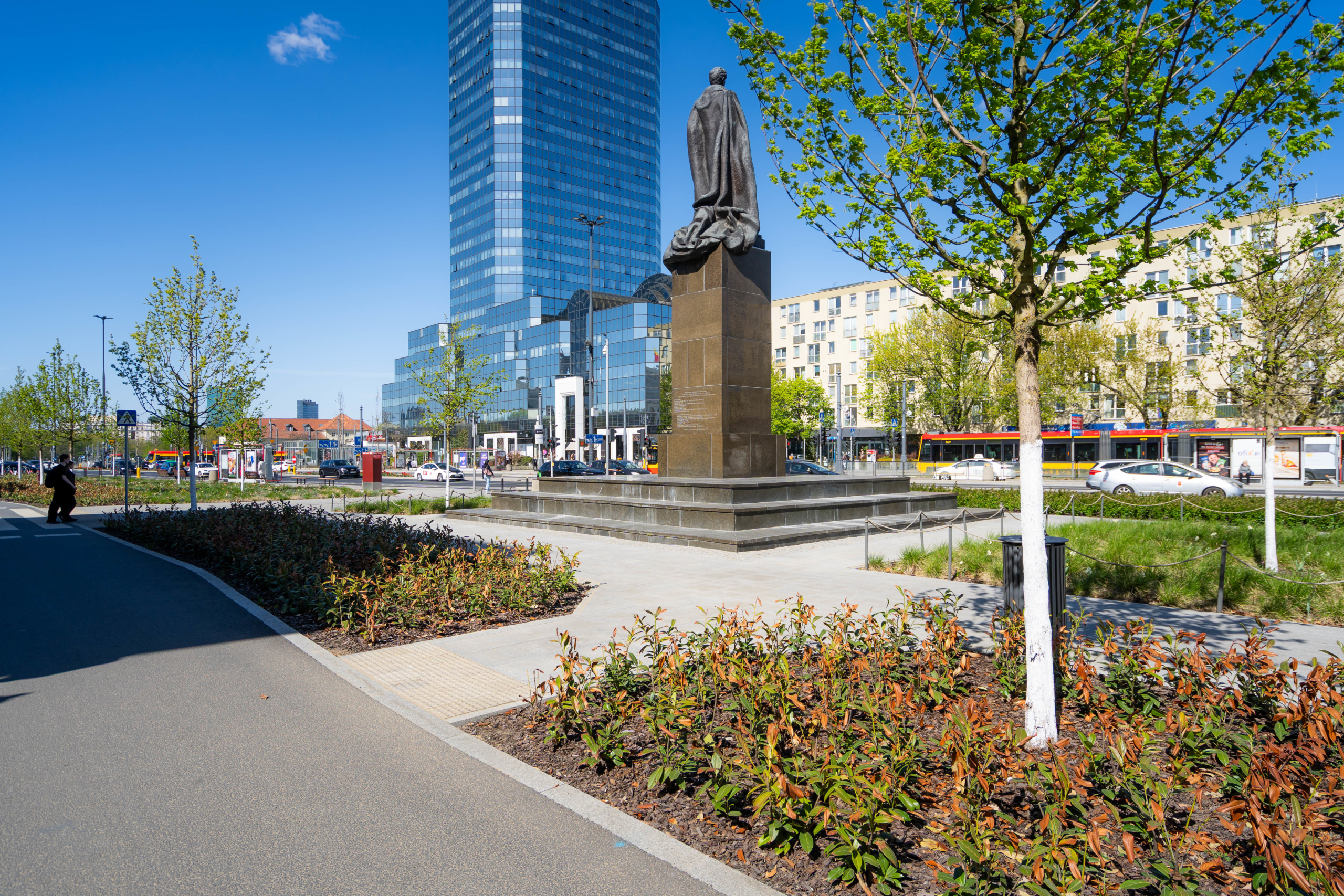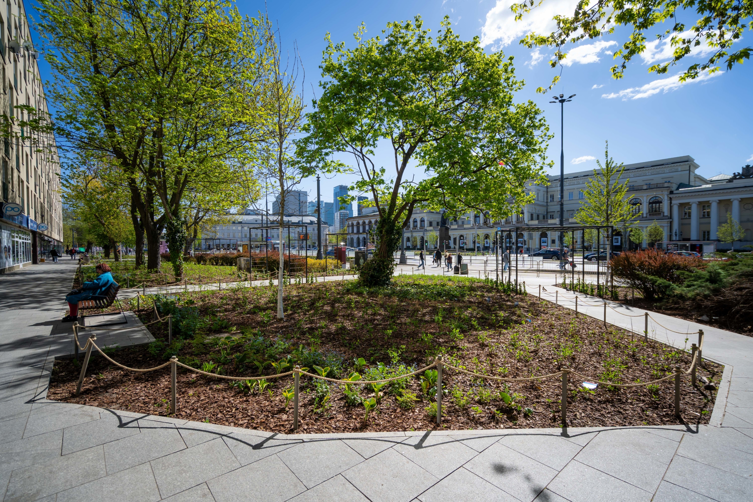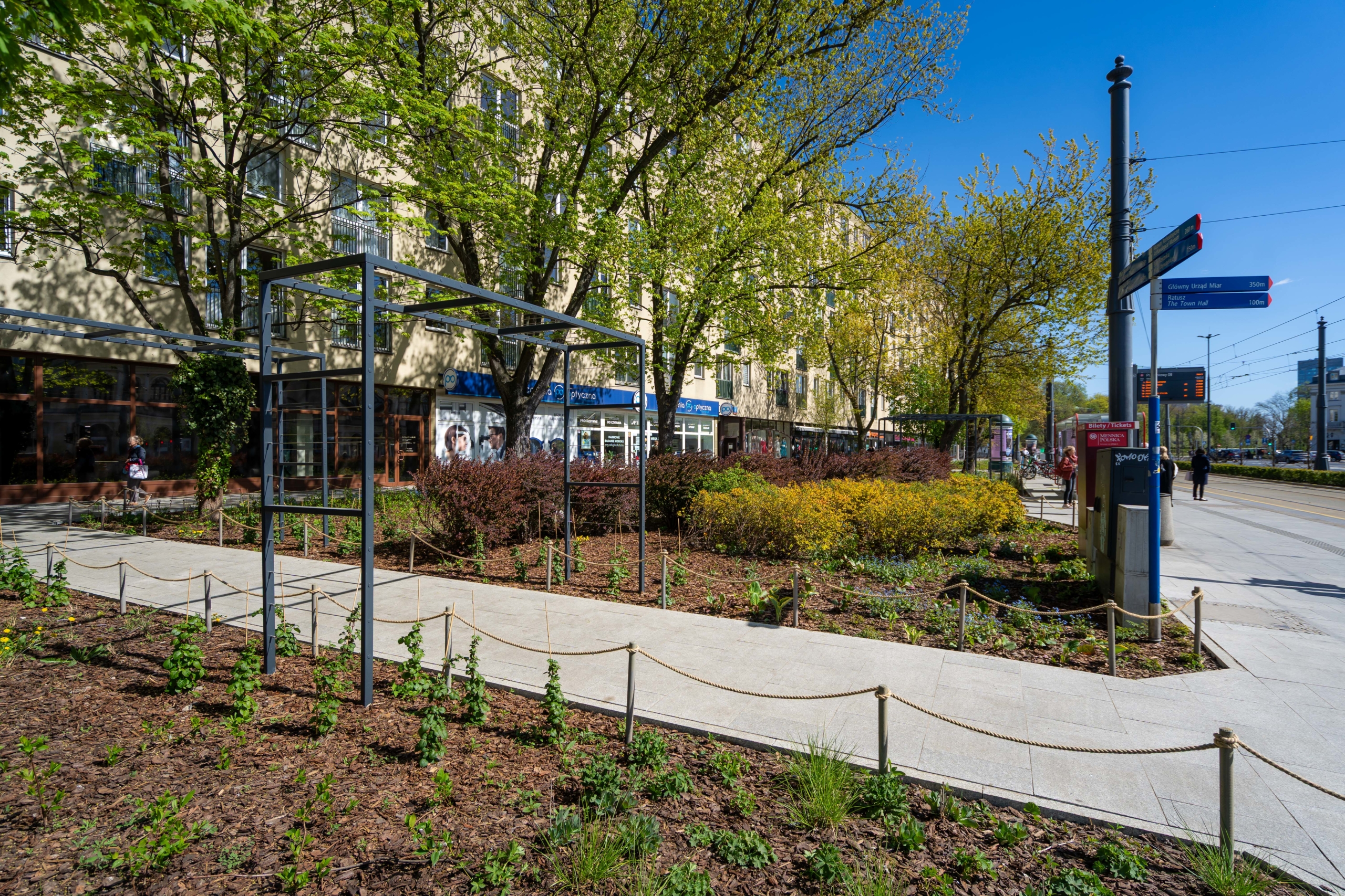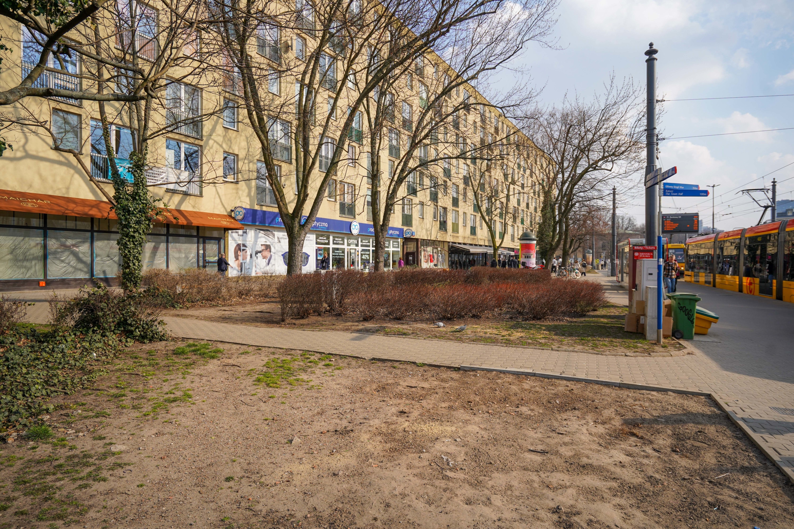 To nie są kosmetyczne zmiany. Zieleń robi na Placu różnicę. Wokół pomnika Stefana Starzyńskiego pojawiły się cztery platany, a przestrzeń uzupełniły róże – w tym polska, pomarańczowa odmiana „Prezydent Stefan Starzyński”. Wzdłuż torowiska posadziliśmy siedem wiśni piłkowanych ‘Kanzan’. Na skwerze przy Placu Bankowym 4 dosadziliśmy siedem drzew (klony, jesiony i czereśnię ptasią), a rabaty wzbogaciliśmy o hortensje, trawy ozdobne i byliny. Nową jakość widać także w małej architekturze – całości dopełniają pergole oraz meble miejskie. Przyjemniej jest tu przebywać. W sumie, w ciągu ostatnich trzech lat, na Placu Bankowym pojawiło się aż 66 nowych drzew.