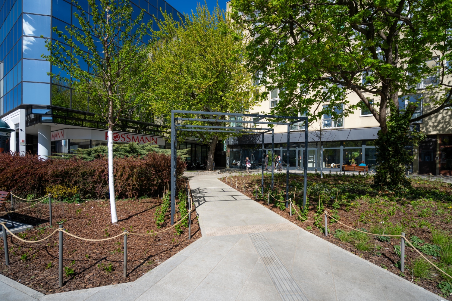 Teraz zakończyliśmy prace w rejonie Błękitnego Wieżowca. Tu również wymieniliśmy nawierzchnię ciągów pieszych, dzięki czemu cała przestrzeń zyskała spójny standard, jest bardziej komfortowa i wygląda lepiej. Rozbetonowanie dużej części terenu pozwoliło stworzyć miejsce dla drzew i zieleni.
