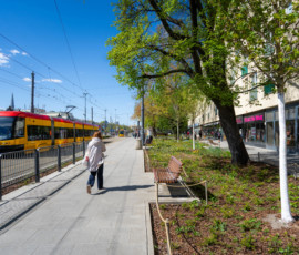 W 2024 roku kontynuowaliśmy zazielenianie i naprawę nawierzchni. Wiosną dosadziliśmy drzewa przy ul. Elektoralnej, a latem wyremontowaliśmy zachodnią jezdnię. Także pas dzielący jezdnie został pozbawiony zbędnego betonu i zyskał nowe nasadzenia.