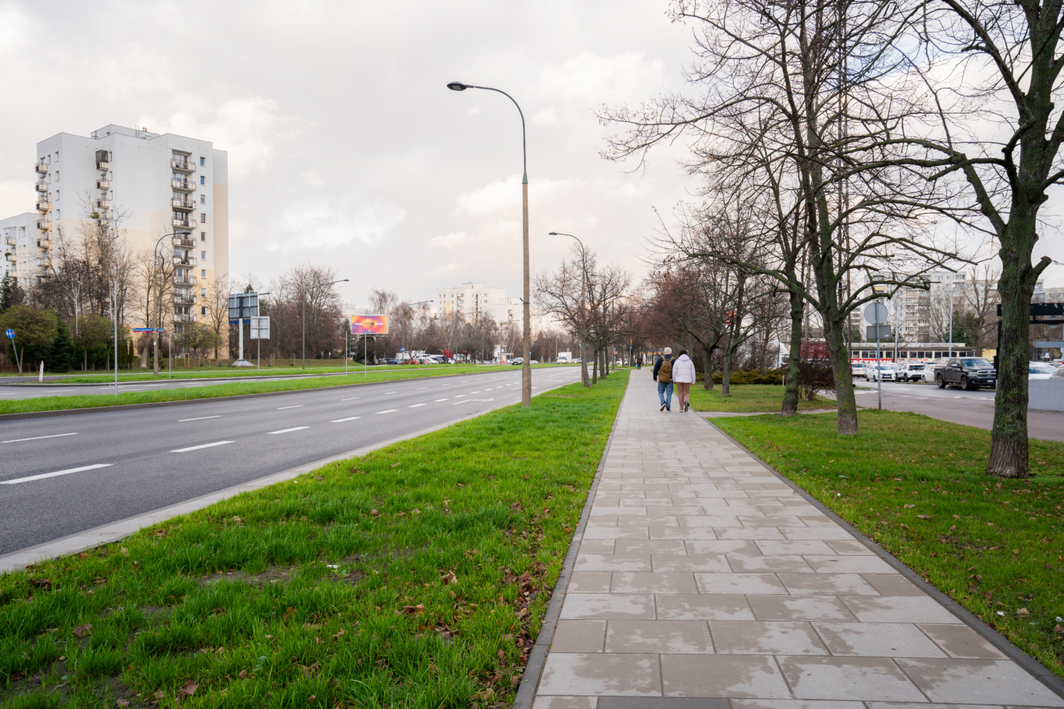 Niemało zmian zaszło też w organizacji ruchu. Między ul. Cynamonową a al. KEN zlikwidowaliśmy zbędny zanikający lewy pas na północnej jezdni. Teraz w jego miejscu mamy trawnik. Skróciliśmy także prawy za skrzyżowaniem z ul. Cynamonową. Dzięki temu powstała nowa zatoka autobusowa, a pozostała część pasa służy tylko do skrętu w prawo. Wprowadziliśmy też kilka poprawek na przejściach dla pieszych. Przeprowadziliśmy też szereg rozpłytowań, które nie tylko uwolniły przestrzeń od zbędnego betonu, ale i uporządkowały teren.