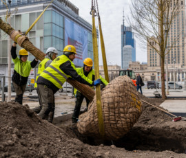 Posadziliśmy na Złotej kilkanaście pierwszych wiązów (Ulmus) „New Horizon” z grupy Resista. Wszystkie mają ponad dziewięć metrów i dojrzewały w szkółce kilkanaście lat. To sprawdzony gatunek, który dobrze radzi sobie w warunkach miejskich, jest odporny na wysokie temperatury i zanieczyszczenia. Łącznie będzie ich tutaj aż 45. Te same drzewa rosną już na ulicach Zgoda i Sienkiewicza. Nowe drzewa uzupełnią nasadzenia z ubiegłego roku. Złota zyska więcej cienia i lepszy mikroklimat, a to przełoży się na większy komfort mieszkańców i gości tego rejonu. Jednak metamorfoza Złotej to coś więcej. W ramach przebudowy powstaje tu ogród linearny, zakładający wprowadzenie ciągłej, uporządkowanej zieleni. Przestrzeń uzupełnią dwie fontanny.