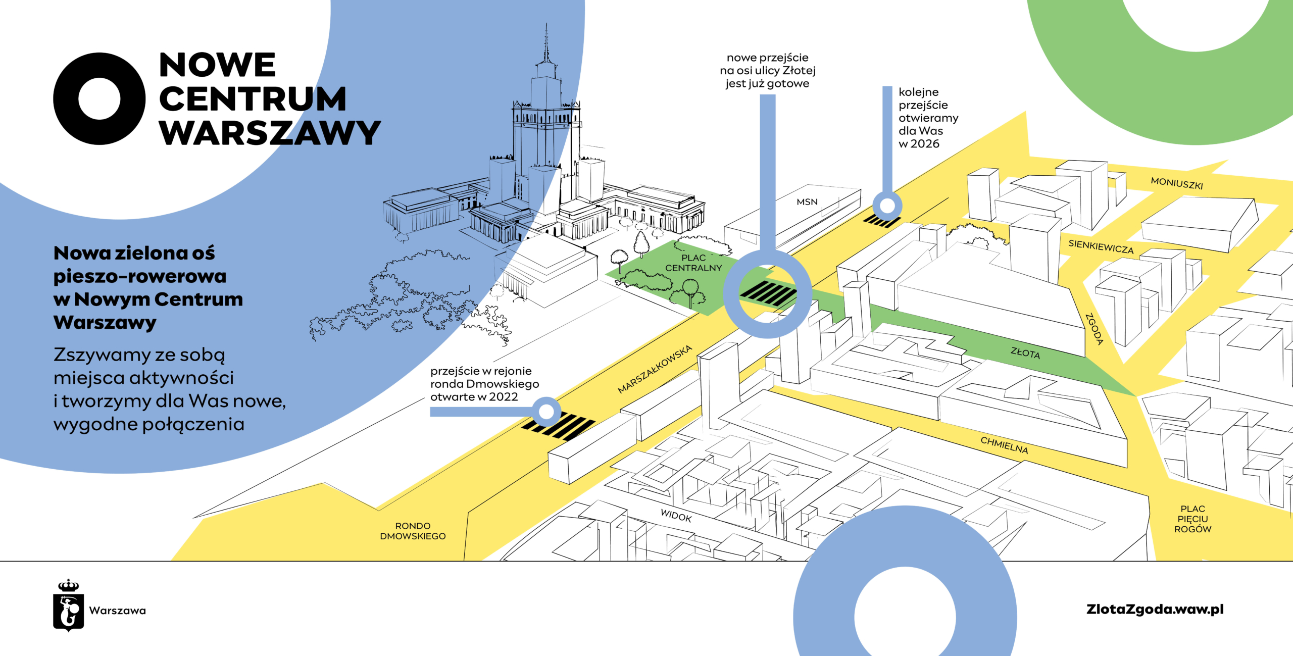 Nowa „zebra” przez ulicę Marszałkowską pozwoli szybko i bezpiecznie dotrzeć z ul. Złotej do Muzeum Sztuki Nowoczesnej, Pałacu Kultury i Nauki oraz na pobliski plac Centralny. Jednocześnie przejście połączyło ten rejon z drugą częścią Nowego Centrum, czyli przebudowywanym kwartałem Złota-Zgoda oraz odmienionymi już ulicami Bracką i Chmielną, które krzyżują się na placu Pięciu Rogów. Celem tej metamorfozy w ścisłym Śródmieściu jest „zszycie” rozproszonych wcześniej wysp aktywności w spójną i atrakcyjną tkankę miejską, w której wygodnie i z przyjemnością można poruszać się pieszo oraz na rowerze.