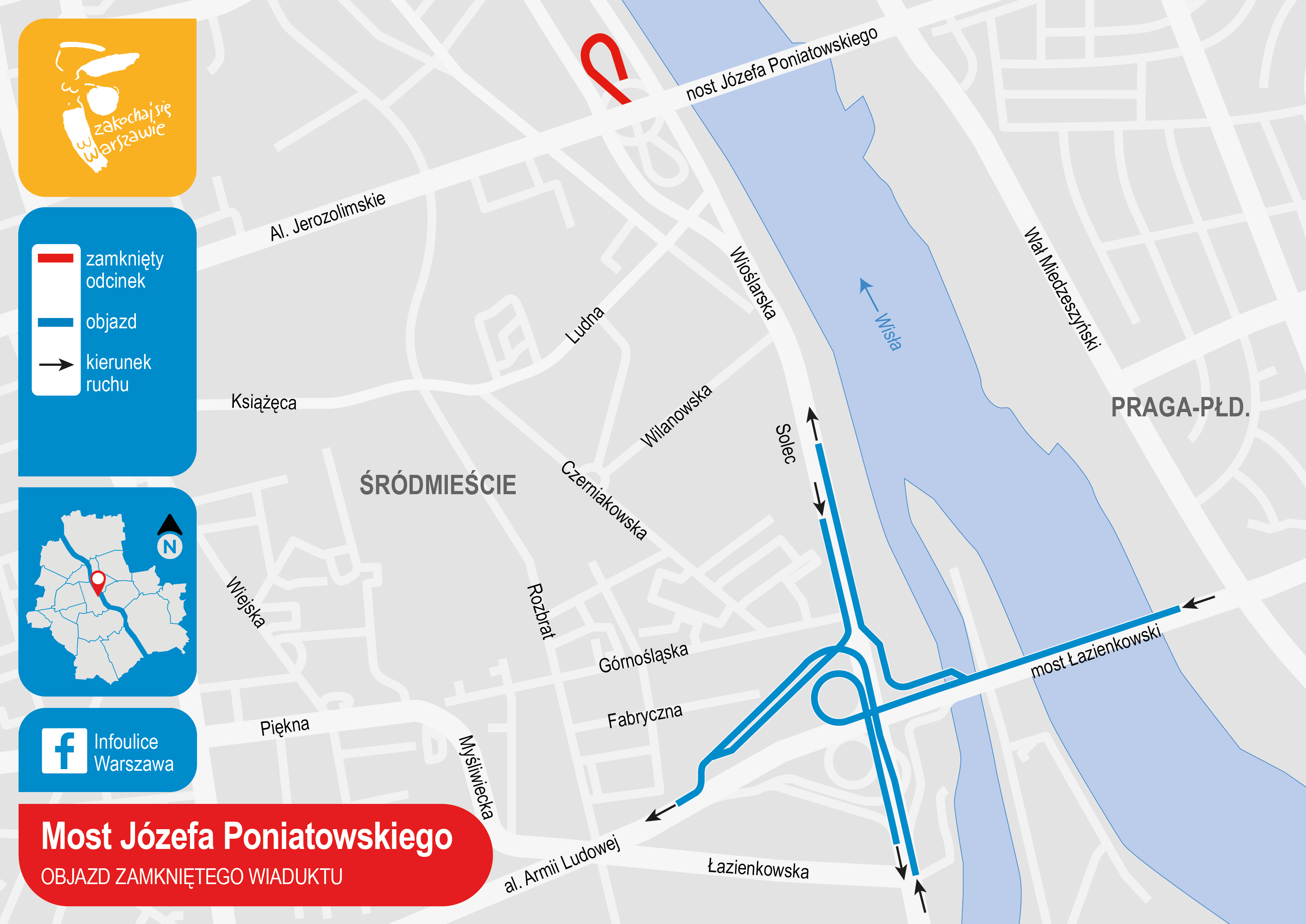 Od piątku, 6 września od godz. 22 wprowadzona zostanie czasowa organizacja ruchu związana z remontem. Wiadukt po północnej stronie mostu Józefa Poniatowskiego zostanie zamknięty. W tym czasie nie będzie można wjechać z Wisłostrady na most w kierunku centrum ani zjechać z mostu (jadąc od strony Grochowa) na Wisłostradę. Objazdy zostaną poprowadzone Trasą Łazienkowską.