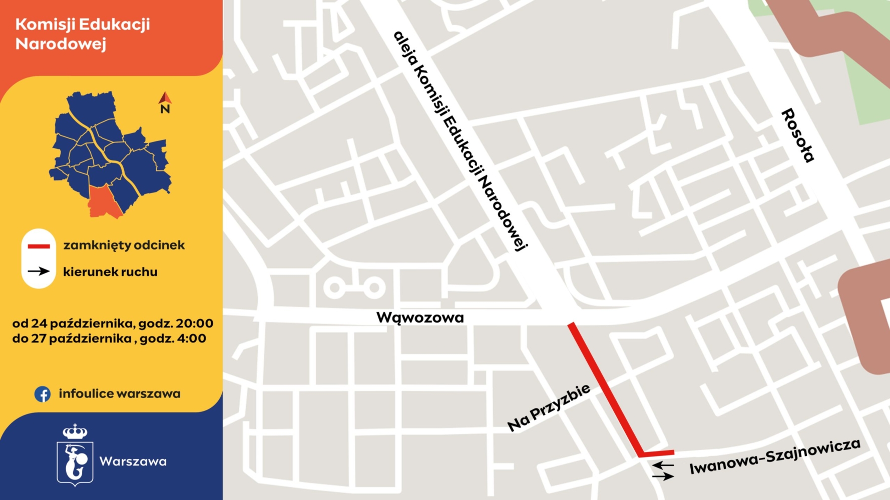 Aleja KEN będzie zamknięta w obu kierunkach pomiędzy ulicami Wąwozową a Iwanowa-Szajnowicza. Zamkniemy także pas ul. Iwanowa-Szajnowicza przy wyjeździe z pętli autobusowej. Kierowcy przejadą do al. KEN wahadłowo po drugiej stronie wysepki. Ulica Na Przyzbie straci połączenie z al. KEN. Za skrzyżowaniem z ul. Wąwozową na jezdni w stronę ul. Płaskowickiej będzie zakaz parkowania, z informacją o możliwości odholowania pojazdu na koszt właściciela.