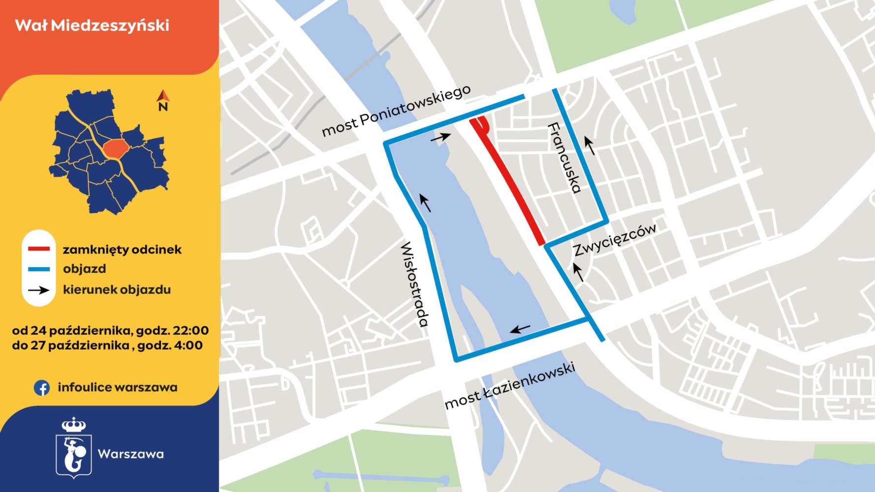 Utrudnienia będzie można ominąć, jadąc z Wału Miedzeszyńskiego mostem Łazienkowskim do Wisłostrady i ponownie przekroczyć Wisłę mostem Poniatowskiego. Objazd poprowadzi także ulicami Zwycięzców i Francuską do al. Waszyngtona. Od strony Pragi-Północ do ronda Waszyngtona będzie można dojechać ulicami Zamoście, Targową i al. Zieleniecką. Jezdnia w kierunku Wawra będzie otwarta.