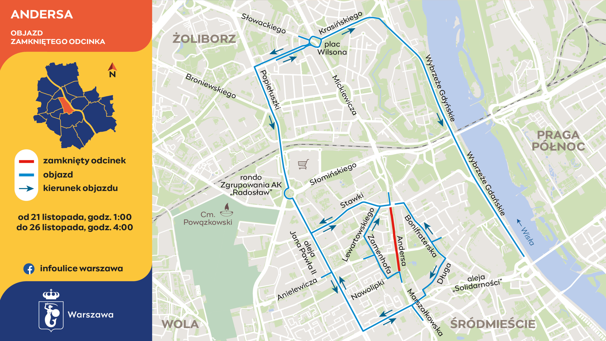 Dla kierowców przygotowano kilka objazdów. Zamknięty odcinek w obie strony będzie można ominąć alejami „Solidarności” i Jana Pawła II, a później ul. Stawki. W stronę Żoliborza tablice pokierują również ulicami Nowolipki, Zamenhoffa, Lewartowskiego i Stawki. Z ul. Świętojerskiej objazd poprowadzi przez plac Krasińskich do ulic Długiej, Bielańskiej i al. „Solidarności”, albo ulicami Bonifraterską i Muranowską do Andersa. Z pl. Wilsona objazd został wyznaczony ul. Krasińskiego i Wisłostradą do al. „Solidarności” lub ul. Popiełuszki do al. Jana Pawła II.