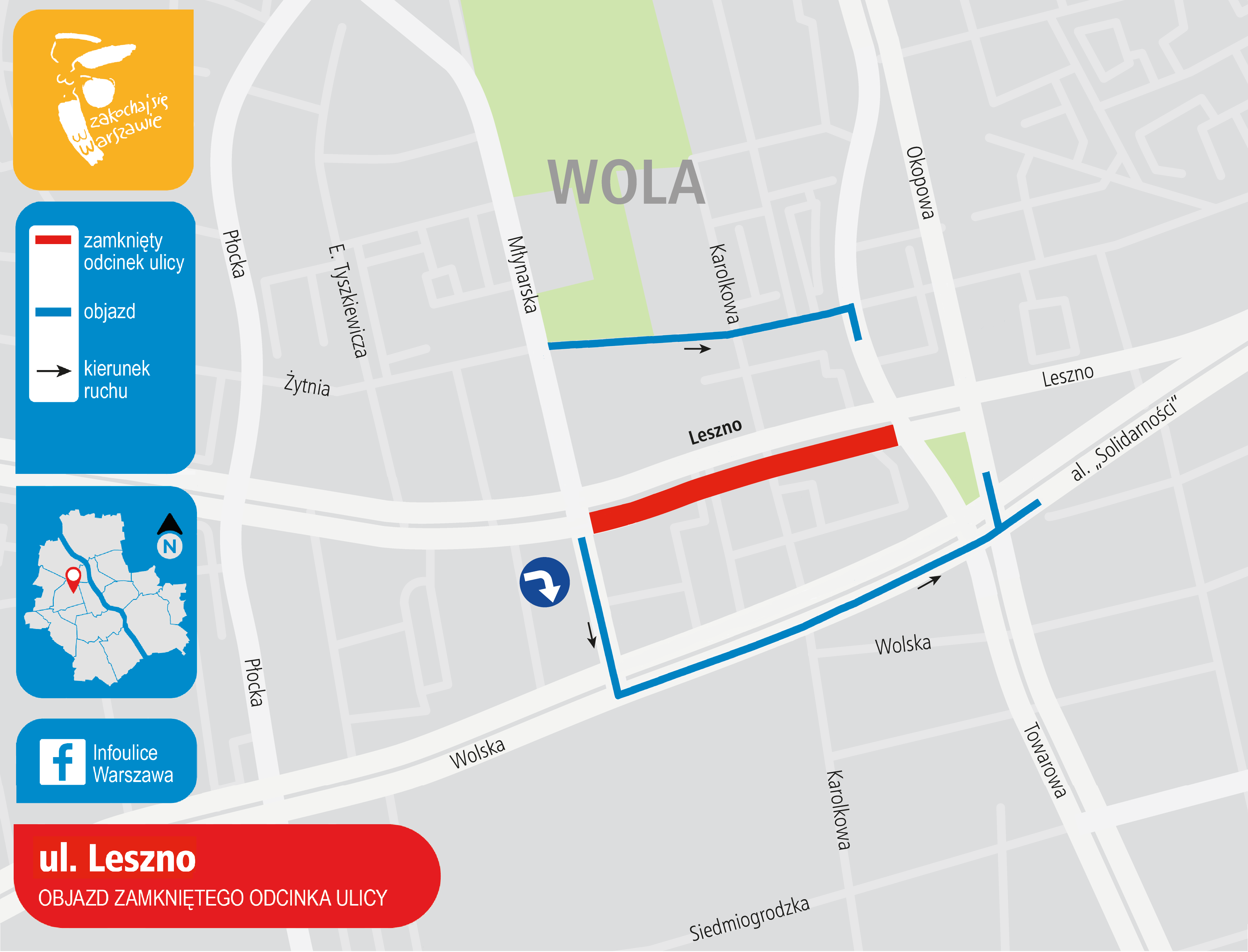 Na czas robót wyłączona z ruchu będzie jezdnia w kierunku centrum na odcinku od ul. Młynarskiej do Okopowej. Ruch w kierunku Bemowa będzie odbywać się bez zmian. Połączenie z ul. Leszno straci ul. Karolkowa (od strony ul. Wolskiej). Objazd zostanie poprowadzony ulicami: Młynarska – Wolska – Okopowa lub ul. Żytnią. Uwaga, kierowcy jadący w kierunku centrum ul. Górczewską nie będą mogli skręcić w lewo na skrzyżowaniu z ul. Młynarską.