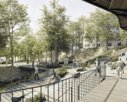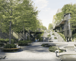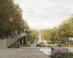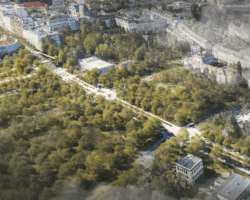 Zwycięski projekt respektuje wytyczne konserwatorskie dotyczące konieczności zachowania i ekspozycji nasypu wiaduktu Markiewicza oraz zachowuje masyw drzew skarpy, stanowiących kontynuację pierzei ul. Karowej.