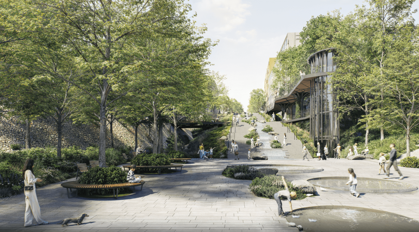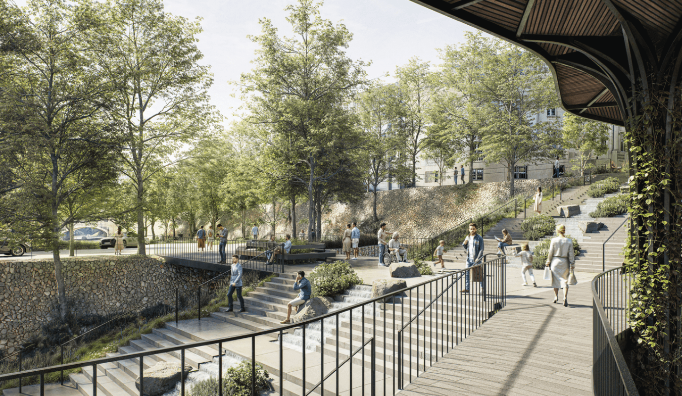 Zwycięski projekt respektuje wytyczne konserwatorskie dotyczące konieczności zachowania i ekspozycji nasypu wiaduktu Markiewicza oraz zachowuje masyw drzew skarpy, stanowiących kontynuację pierzei ul. Karowej.