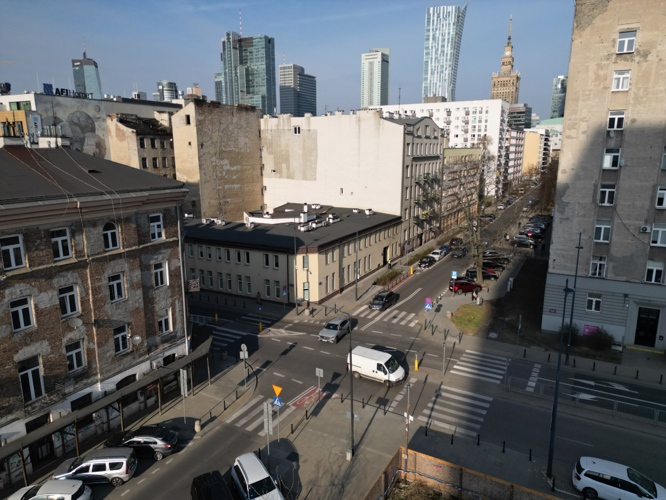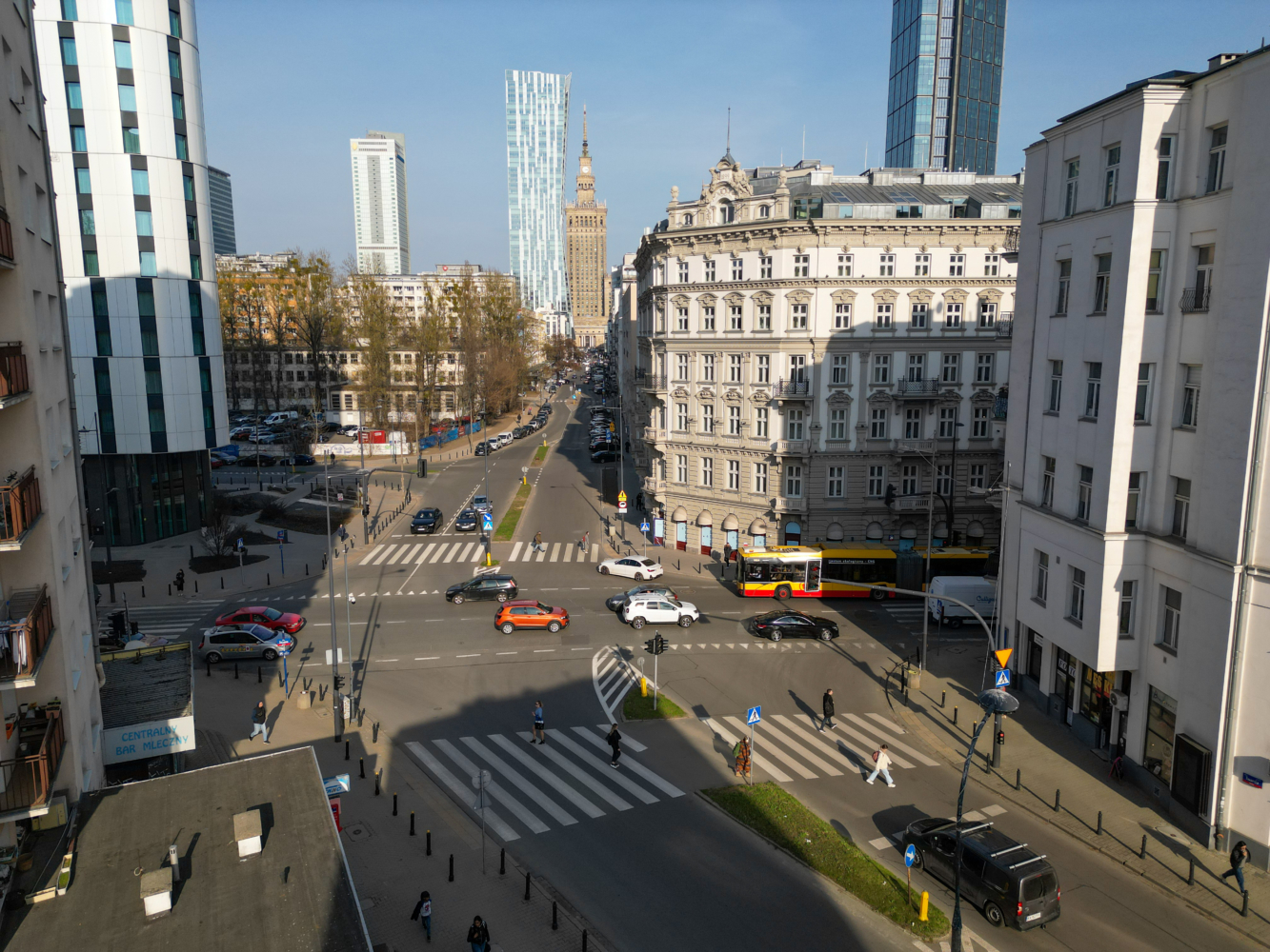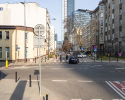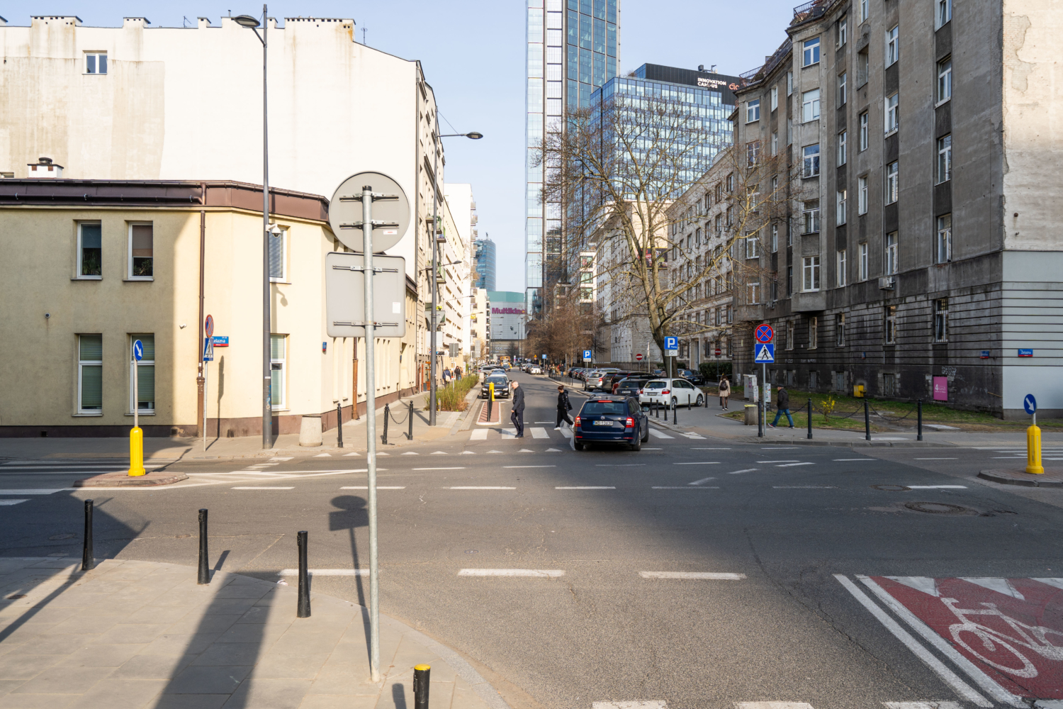 Najwięcej będzie się jednak działo na skrzyżowaniu ulic Żelaznej i Złotej o powierzchni blisko 1500 m2. Dla porównania mieszkania w Warszawie mają średnio 60 m2. Czyli zmieściłoby się na nim mniej więcej 25 mieszkań. Nie ma potrzeby, by to skrzyżowanie zajmowało tyle miejsca. Przeskalowaną jezdnię wykorzystamy na wyznaczenie lewoskrętów w każdej relacji. Zwęzimy także każdy wlot skrzyżowania.
