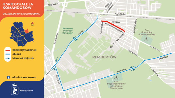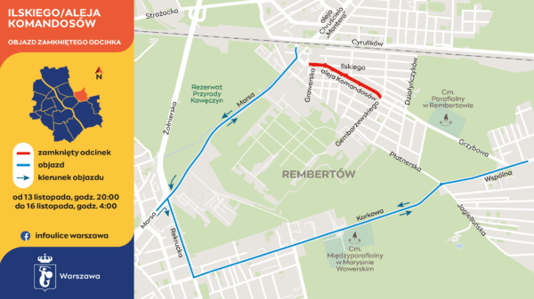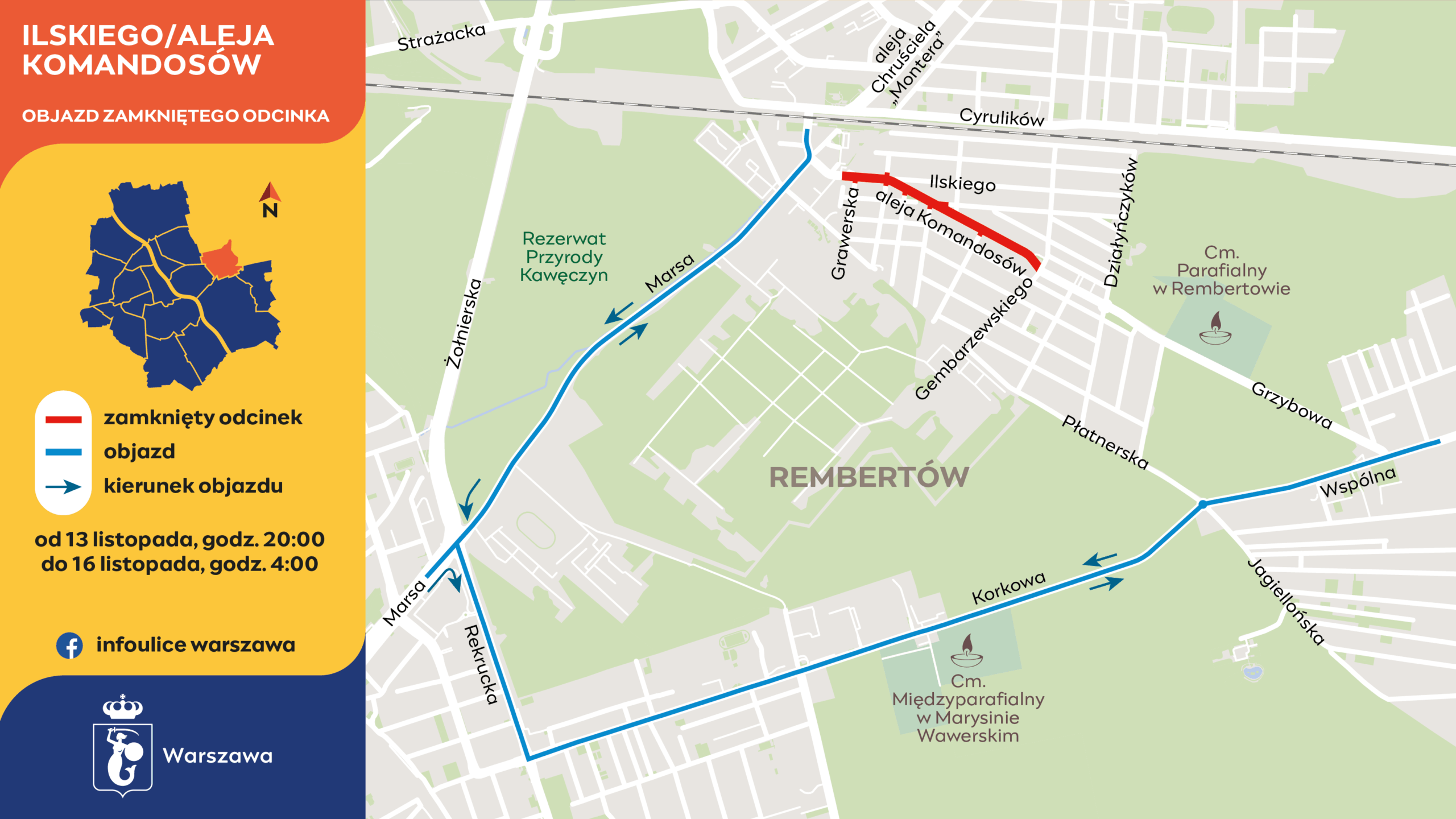 W czwartek, 13 listopada o godz. 20 zamkniemy cały remontowany odcinek ul. Ilskiego i al. Komandosów – od bocznicy kolejowej do skrzyżowania z ulicami Gembarzewskiego i Niedziałkowskiego. Ulice dochodzące do ul. Ilskiego i al. Komandosów będą kończyły się ślepo. Dla kierowców zostanie wyznaczony objazd ulicami Marsa, Rekrucką, Korkową i Wspólną w Wesołej.