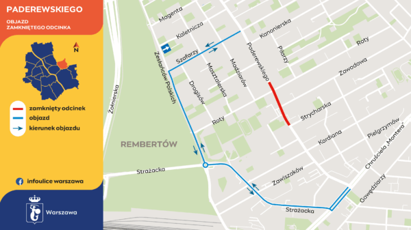 Ulica Paderewskiego będzie zamknięta między ulicami Strycharską a Roty wraz ze skrzyżowaniami z tymi ulicami. Kierowcy z obu stron dojadą tylko do miejsca prac. W miarę możliwości drogowcy zapewnimy dojazd do posesji. Jeżeli będziemy musieli zamknąć przejazd, mieszkańcy zostaną poinformowani z wyprzedzeniem.