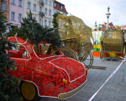 27-metrowa multimedialna choinka, która powstanie z energooszczędnych i nowoczesnych materiałów, stanie na placu Zamkowym. Przy okazji wieczornych, zimowych spacerów mieszkańcy i turyści będą mogli podziwiać także figury w kształcie niezapomnianego samochodu Syrenka i retro motocyklu Ryś.