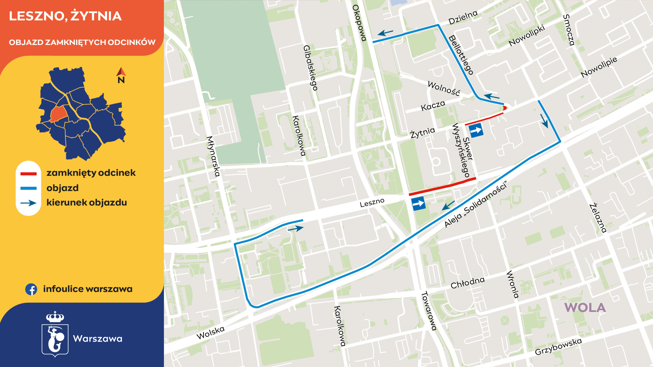 Z ulicy Wolność nie będzie można skręcić w stronę Okopowej. Z kolei od Żelaznej trzeba będzie pojechać w ulicę Wolność. Objazdy do Okopowej poprowadzą Żelazną i Aleją „Solidarności” lub ulicami: Wolność, Bellottiego i Dzielną.