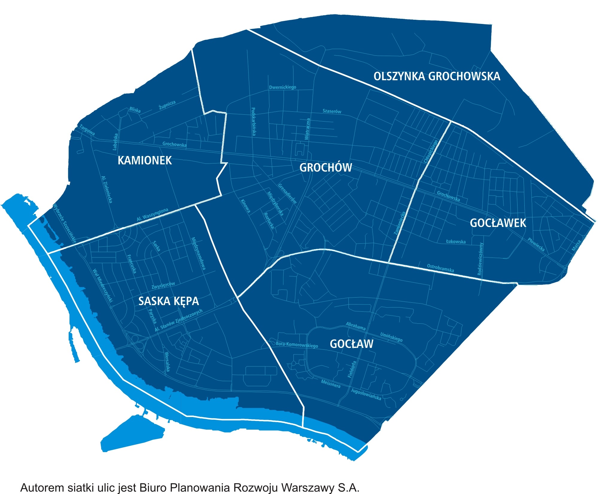 Al. Waszyngtona-Al. Poniatowskiego- nurt Wisły w kierunku południowym od Mostu Poniatowskiego do wysokości planowanej Al. Tysiąclecia – planowana Al. Tysiąclecia do Al. Waszyngtona.